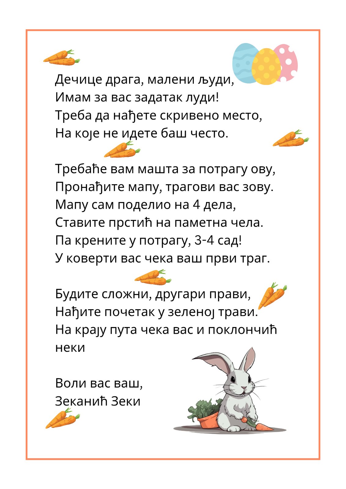 У сунчану недељу, 5. априла, у мирисној и зеленој Миљаковачкој шуми, веселе „пчелице“ – ученици одељења 2/2 са својом учитељицом Мајом Динић – кренулеуле су у чаробну ускршњу авантуру. Њихов друг, несташни и добродушни Зеканић Зеки, припремио је за њих тајанствене и маштовите трагове. Задатак по задатак, корак по корак, малишани су откривали скривене путоказе који су их водили ка великом циљу. Уз машту, радозналост и другарство, потрага је постала прави празнични изазов – мапа подељена на четири дела, коју су могли да саставе само ако буду сложни и прави пријатељи.