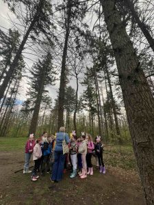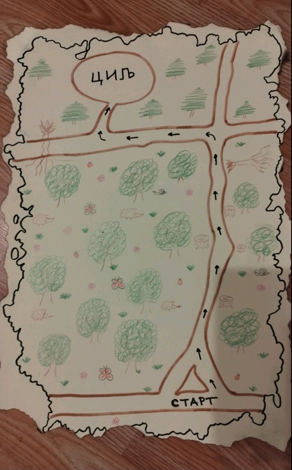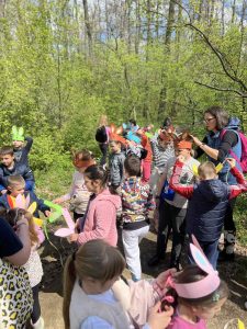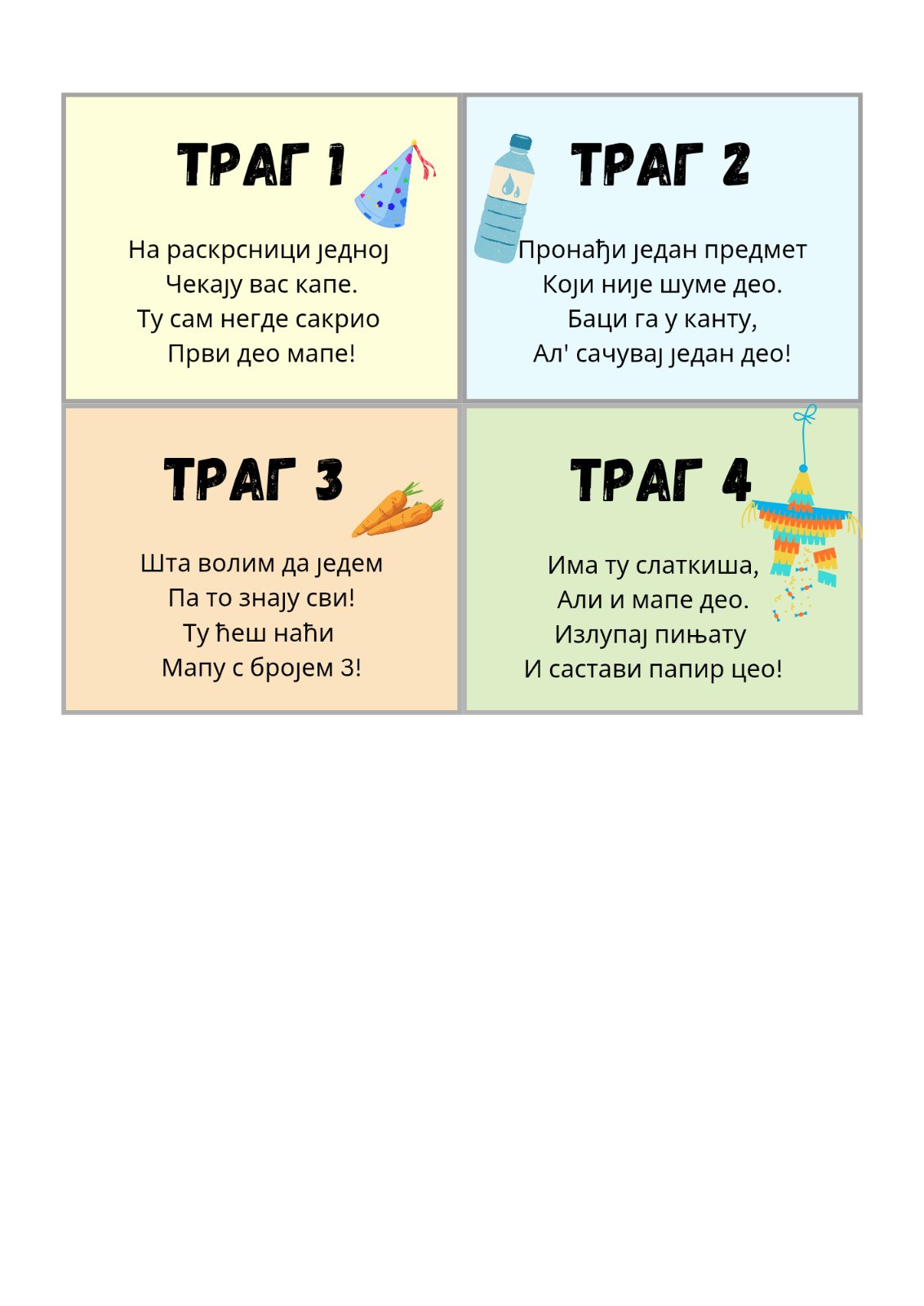 На првом трагу чекале су их шарене капе, које су радосно везали на своје мале главице. Потом су, као прави чувари природе, препознали шта не припада шумском свету – пластичне флаше које су вредно сакупили и однели у канте за смеће. Тако су обновили своје знање из екологије и показали колико је важно чувати чисту и мирисну шуму. Затим су утврдили знање о биљоједима и помогли свом другару Зеканићу Зекију да пронађе своју омиљену храну – сочну, наранџасту шаргарепу. Као знак захвалности, Зеки им је оставио последњи траг – шарену пињату из које су, уз смех и радост, добили слатке бомбоне.