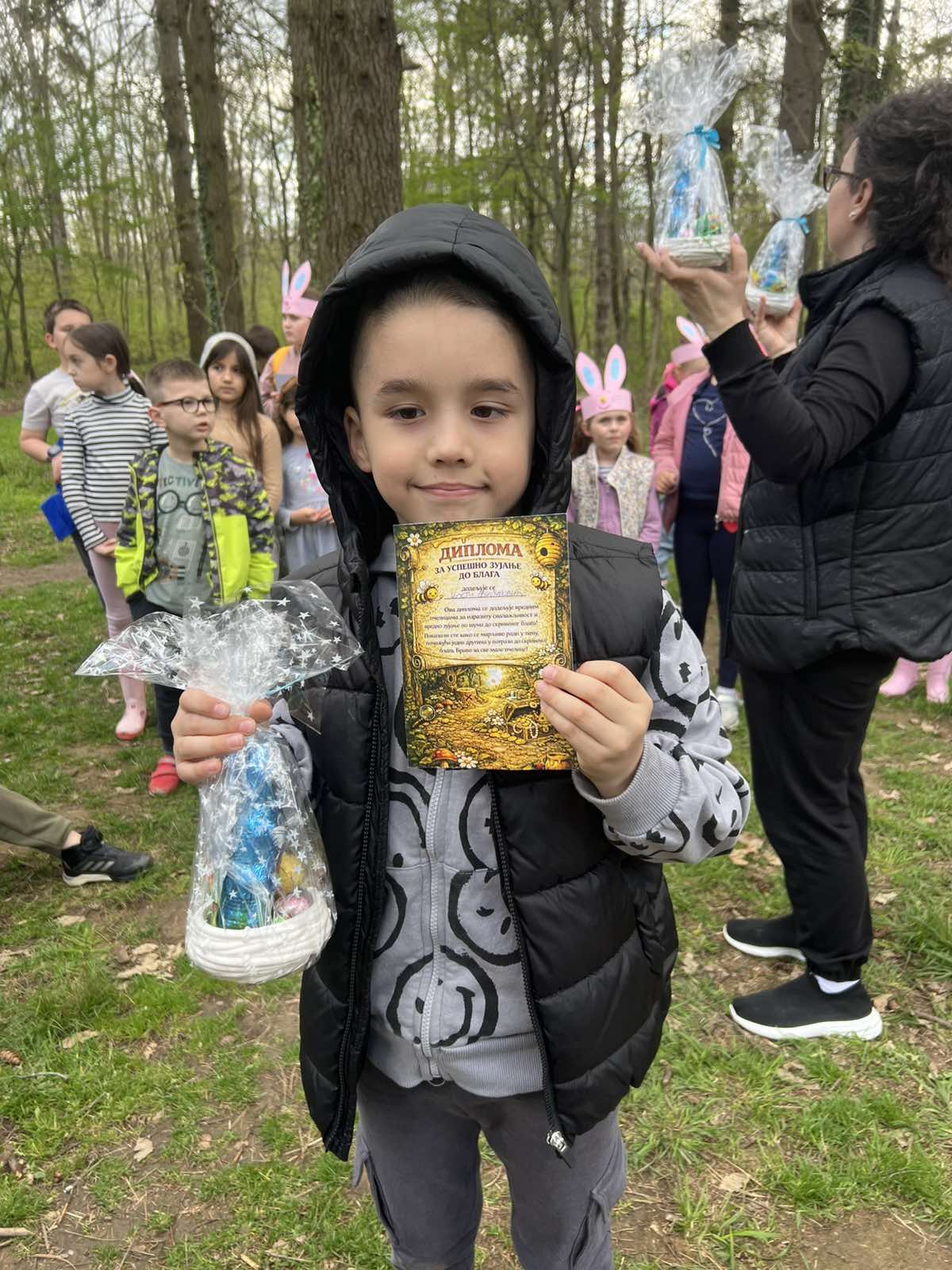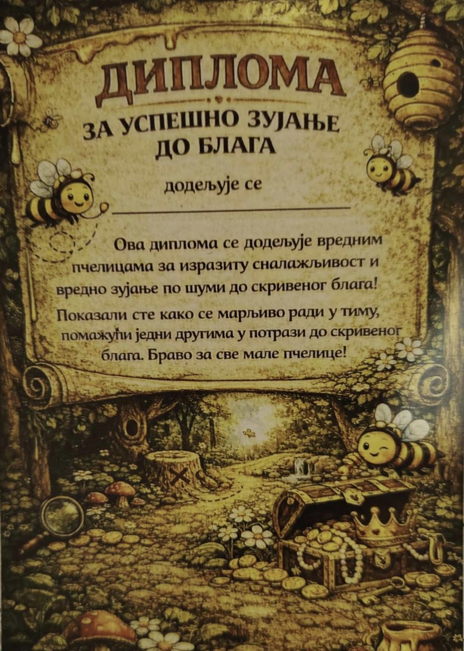 Са сва четири трага „пчелице“ су саставиле мапу и пронашле пут до своје награде, коју је њихов друг Зеканић припремио поводом најрадоснијег празника – Ускрса. Уз освежавајуће сокове, укусне сланише, игру, смех и весеље, „пчелице“ су провеле незабораван дан у чаробној шуми са својом учитељицом. На крају, свако дете је добило ускршњи поклон и свечану диплому за одлично „зујање по шуми“.